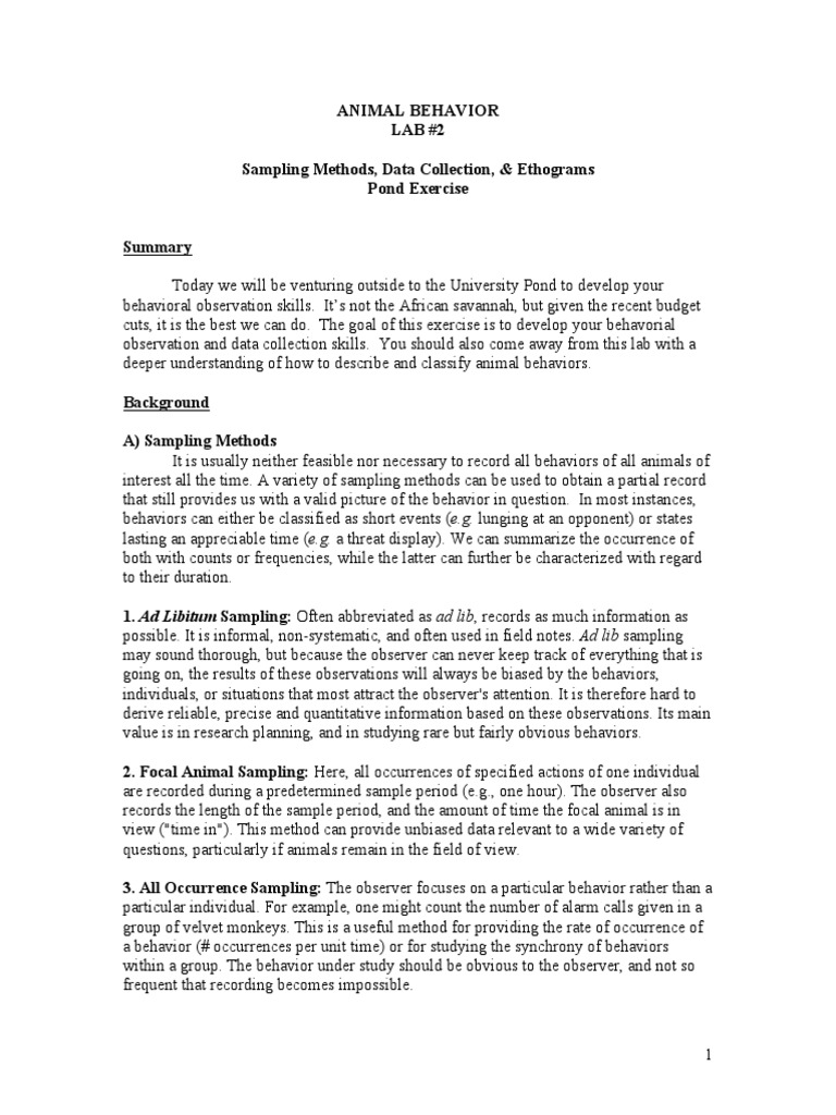 Focal animal sampling (using continuous sampling of individuals) indicated that one heifer was representative of the entire pen of 10 animals (continuous) for all maintenance behaviors except. In this sampling method an individual from a group of animals is selected and all behaviours are recorded for a specified time period. With this method, all it is a sample of states (you are unlikely to catch an animal in the act of doing a behavior of short. This technique is often used to study specific behavior patterns. • sampling all occurrences of adding selected.